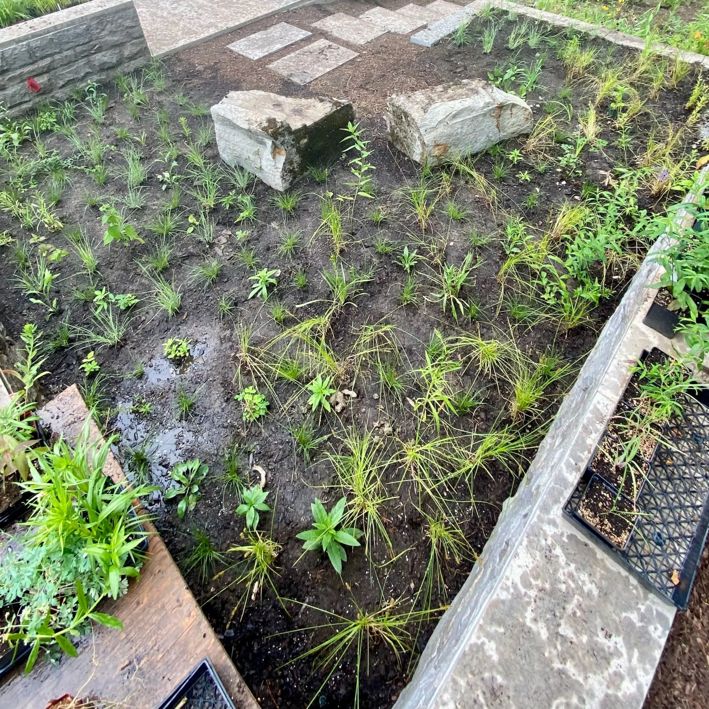 Careful site preparation and regionally appropriate native plants, sourced from Ontario nurseries and installed with attention to spacing, succession, and future growth.